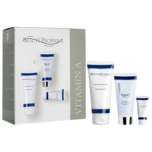 Gaveæske VITAMIN A fra Beaute Pacifique. I denne gaveæske får du nogle af Beauté Pacifiques bestsellere, der hører til i enhver hudplejerutine. I æsken er en lækker renseskum, en fugtgivende dagcreme samt en potent A-vitamin natcreme, – alle sammen produkter der skaber en sund hud i balance. Æsken henvender sig både til mænd og kvinder og giver god anti-age effekt. Produkterne kan bruges af alle hudtyper og egner sig også godt til behandling af urenheder, akne og tørhed. Æsken indeholder: Renseskum: Nemt og effektivt produkt til afrensning af huden. Renseskummet er rens og tonic i ét og fjerner snavs, mindsker tilstoppede porer samt overflødigt fedtstof. Fugtgivende dagcreme til alle hudtyper: Let dagcreme som giver huden intens fugt. Tilfører blandt andet huden kollagen og C-vitamin. Super3 Booster: Natcreme der er rig på A-vitamin og har anti-age effekt. Modvirker urenheder og sørger for en hud i balance. Cleansing foam - 50 ml. Ingredients: Aqua (Water), Potassium Stearate, Potassium Laurate, Potassium Myristate, Potassium Palmitate, Glycerin, PEG-7 Glyceryl Cocoate, Glyceryl Stearate, PEG-100 Stearate, Propylene Glycol, Phenoxyethanol, Cetearyl Alcohol, Tridecyl Stearate, Tridecyl Trimellitate, Ethylhexylglycerin, Citrus Limon (Lemon) Fruit Extract, Dipentaerythrityl Hexacaprylate/Hexacaprate, Tetrasodium Iminodisuccinate, Glycyrrhiza Glabra (Licorice) Root Extract, Citric Acid, Potassium Sorbate, Sodium Benzoate, Parfum (Fragrance). Moisturizing Day Creme - 20 ml. Ingredients: Aqua (Water), Squalane, Glycerin, Caprylic/Capric Triglyceride, Behenyl Alcohol, Lanolin, Glyceryl Stearate, PEG-100 Stearate, Dimethicone, C12-15 Alkyl Benzoate, Stearic Acid, Propylene Glycol, Cetearyl Alcohol, Urea, Phenoxyethanol, Cetyl Palmitate, Tocopheryl Acetate, Ceteth-20 Phosphate, Tocopherol, Lanolin Alcohol, Dicetyl Phosphate, PEG-20 Stearate, Ethylhexylglycerin, Hydrolyzed Collagen, Acrylates/C10-30 Alkyl Acrylate Crosspolymer, Citrus Limon (Lemon) Fruit Extract, Tetrasodium Iminodisuccinate, Aloe Barbadensis (Aloe Vera) Leaf Juice Powder, Potassium Sorbate, Sodium Benzoate, Citric Acid, Sodium Hyaluronate, Parfum (Fragrance) Super3 booster - 50 ml. Ingredients: Aqua (Water), Glycerin, Squalane, Glyceryl Stearate, Tridecyl Stearate, Diethylhexyl Succinate, Butyrospermum Parkii (Shea) Butter Extract, PEG-100 Stearate, Tridecyl Trimellitate, Argania Spinosa (Argan) Kernel Extract, Cetearyl Alcohol, Prunus Amygdalus Dulcis (Sweet Almond) Oil, Tocopheryl Acetate, Phenoxyethanol, Behenyl Alcohol, Retinyl Palmitate, Argania Spinosa (Argan) Kernel Oil, Sesamum Indicum (Sesame) Seed Oil, Saccharide Isomerate, Stearic Acid, Sodium Lactate, Tocopherol, Dipentaerythrityl Hexacaprylate/Hexacaprate, Retinyl Acetate, Glycine Soja (Soybean) Extract, Hordeum Vulgare Extract, Arachis Hypogaea (Peanut) Oil, PEG-20 Stearate, Glycyrrhiza Glabra (Licorice) Root Extract, Lanolin, Serenoa Serrulata Fruit Extract, Beta-Sitosterol, Ethylhexylglycerin, Acrylates/C10-30 Alkyl Acrylate Crosspolymer, Marrubium Vulgare Extract, Tetrasodium Iminodisuccinate, Citric Acid, Potassium Sorbate, Propolis Cera, Sodium Citrate, Sodium Benzoate, Phenethyl Alcohol, Parfume (Fragrance)