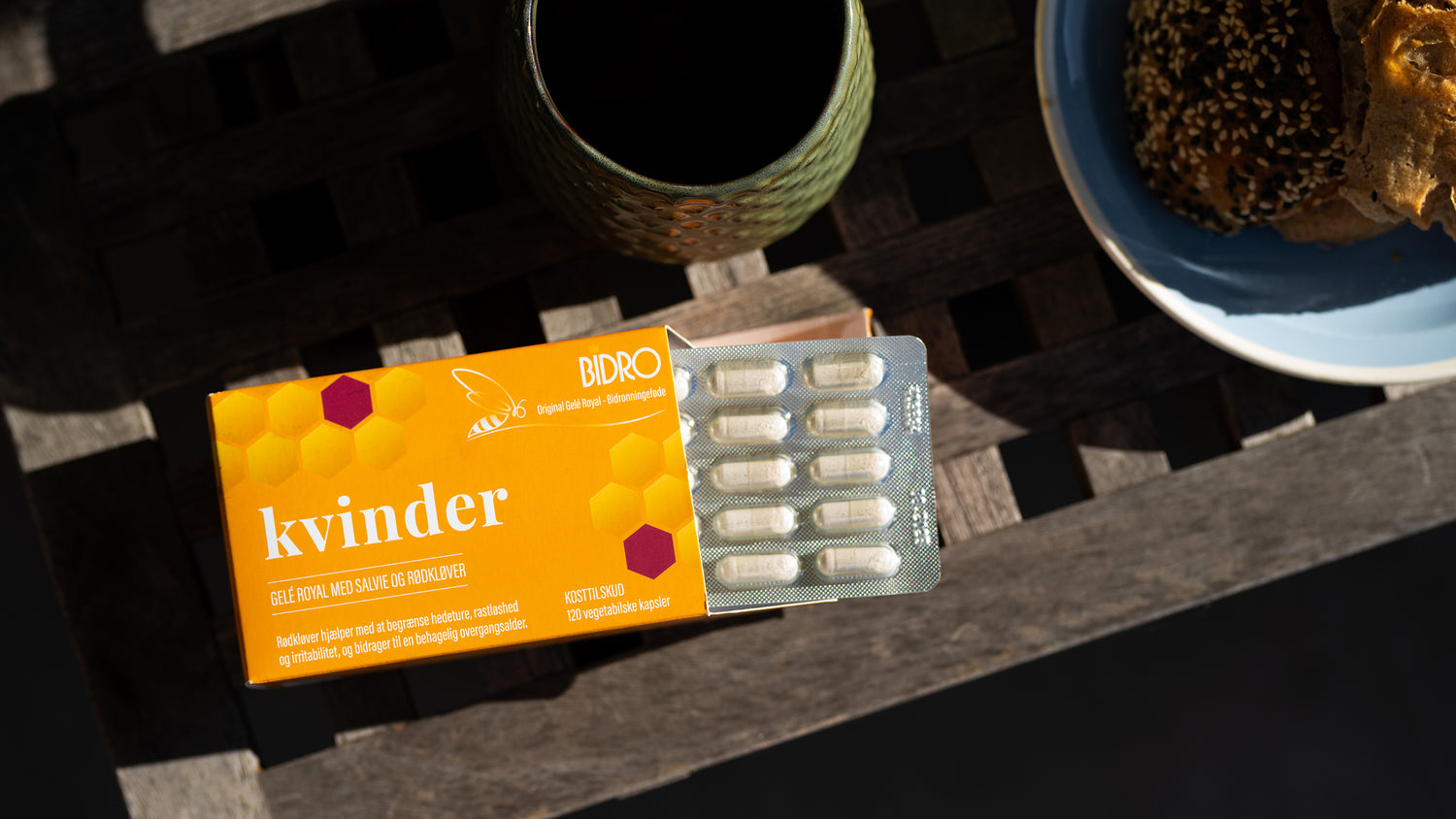 Bidro Kvinder i vegetabilske kapsler. - B6 vitamin bidrager til at regulere hormonaktiviteten og til immunsystemets normale funktion. - E vitamin bidrager til at beskytte cellerne mod oxidativ stress. - Magnesium bidrager til at mindske træthed og udmattelse, til nervesystemets normale funktion og til at vedligeholde normale knogler. - Rødkløver hjælper med at begrænse hedeture, rastløshed og irritabilitet og bidrager til en behagelig overgangsalder. Er du en af de mange kvinder, der lever et aktivt liv, også selv om man er kommet i overgangsalderen? Det kan være svært, når man begynder at mærke forandringerne i kroppen, så som hedeture og øget svedproduktion, også selv om man ved, at denne overgang kommer. Prøv Bidro Kvinder, det kunne være, at denne sammensætning var noget for dig.