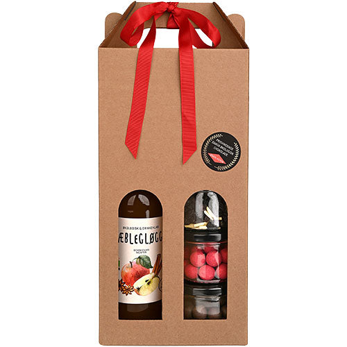 Gaveæske med økologiske Dragée Hasselnødder i 2 varianter samt økologisk æblegløgg uden alkohol.