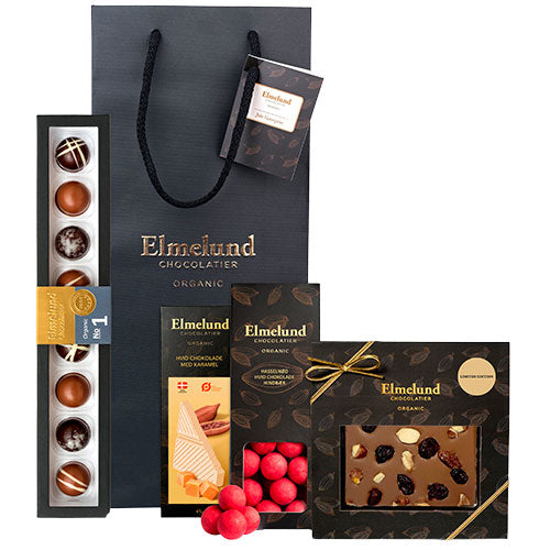 Fyldte chokolader, hasselnød dragée og chokoladeplader i en flot Elmelund gavepose.