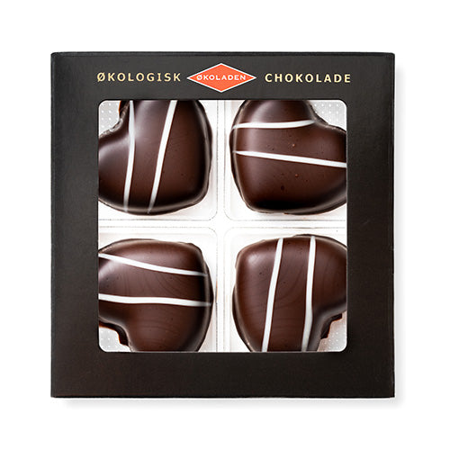 Økologiske marcipanhjerter med marcipan, overtrukket med 70 % mørk chokolade og en streg af hvid chokolade.