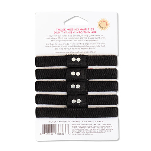 Kooshoo hårelastikker er lavet af certificeret økologisk bomuld og naturgummi. De er 100 % plastikfri og 100 % nedbrydelige og passer godt på både dit hår og moder jord. Hårelastikkerne sidder godt og skånsomt i håret, og passer også rundt om de fleste håndled. Elastikkerne er farvet med økologisk certificeret farve, så de passer til sort, brunt, blond og rødt hår. Derudover laves der også en pakke med flotte, farverige elastikker. En pakke indeholder 5 hårelastikker. Elastikkerne kan vaskes koldt i vaskemaskine, sammen med lignende farver. Både elastikker og emballage er plastikfri. Designet i Canada. Etisk og ansvarligt produceret i Indien. Fås i farverne Blond, Sort, Brun/Sort, Farverig og Ginger.