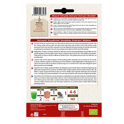 Økologiske lucernefrø til spiring smager mildt af salat. De bruges rå og kan anvendes i alt fra sandwich og smørrebrød til wraps og dips. Kun fantasien sætter grænser.