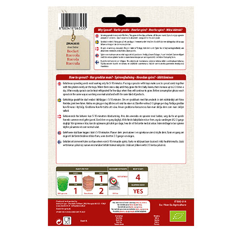 Økologiske rucolafrø til spiring giver lækre spirer, der smager som en rucolasalat.