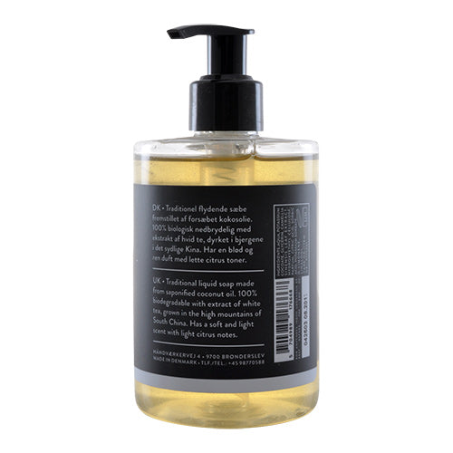 Traditionel flydende sæbe fremstillet af forsæbet kokosolie. Både til hænder og krop. Flydende sæbe med ekstrakt af hvid te, dyrket i bjergene i det sydlige Kina. Har en blød og ren duft med lette citrus toner.