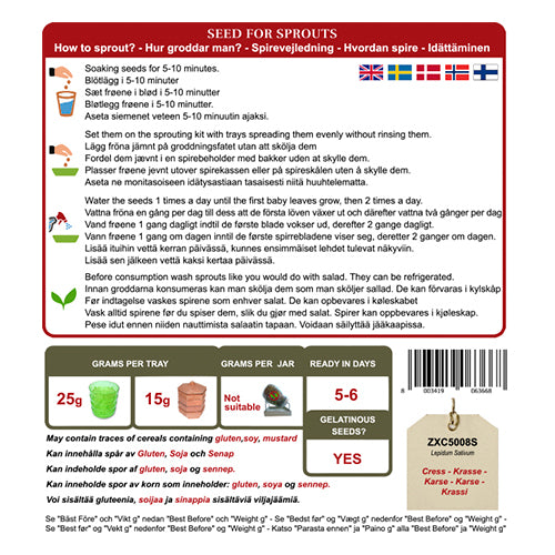 Økologiske karsefrø til spiring giver den karakteristiske karse, vi alle kender. Karsen er specielt delikat på æggemadder i både madpakke og på smørrebrød. Karsen kan dog også bruges i sandwich og salater samt til pynt på varme og kolde retter.