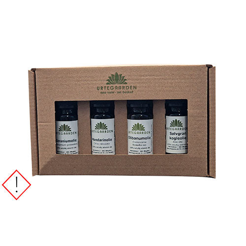 Geraniumolie 10 ml, mandarinolie 10 ml, olibanumolie 5 ml, sølvgrankogleolie 10 ml