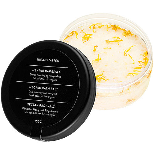 Nektar badesalt - Aromatisk badesalt, der forvandler et almindeligt karbad eller fodbad til en oplevelse udover det sædvanlige. Giv dit personlige velvære et boost med et forfriskende honningbad. Lad kombinationen af havsalt, morgenfrue, mandelolie og honning pleje din krop, mens forfriskende æteriske olier i form af citrongræs, appelsin og citron opløfter sindet.