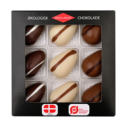 9 stk. assorteret økologiske fyldte påskeæg med pebermynte creme, lakrids creme eller hasselnød nougat. 3 gode smag.