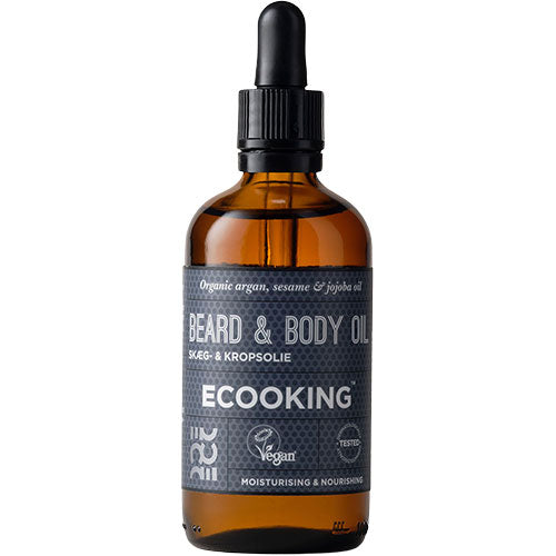 Ecooking skæg- og kropsolie er en multifuntionel olie til mænd, som kan bruges til bl.a. barbering, som kropsolie og til pleje af skægget. Skæg- og kropsolie er ideel til at undgå skægpest og indgroede skægstubbe, og den har en frisk duft af citrus. En olie med mange egenskaber. Brug den til at fugte, pleje og tilføre glans til skægget. Til barbering. Både skæg-, intim- og issebarbering, før, under og efter. Som pleje og fugt til hud og hår. Som serum under ansigtscreme. I fodbad og karbad. Til tør og skællet hovedbund. Som massageolie og som pleje til tørre neglebånd. Skæg- og kropsolie indeholder bl.a. økologisk jojobaolie, økologisk sesamolie, økologisk abrikoskerneolie og økologisk arganolie, som alle bidrager til at genoprette, blødgøre og gennemfugte hud og hår, samt forbedre hudens barriere.